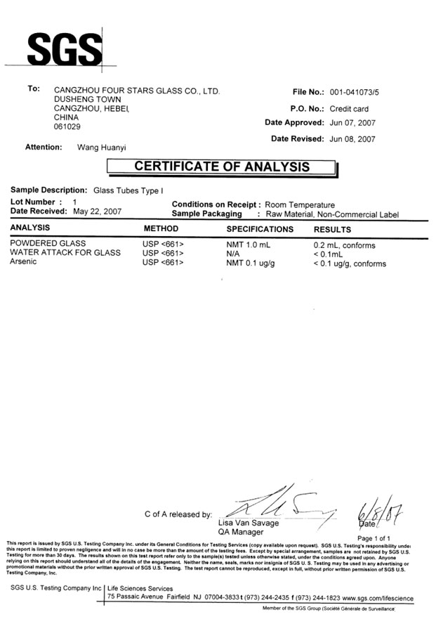 ISO國際標準,玻璃管顆粒法耐水I級為耗酸量小于1ML,國際同行業(yè)的數(shù)值是0.35ML,而我們是0.2ML(數(shù)值越小質(zhì)量越好),此項技術(shù)已經(jīng)獲得了美國權(quán)威檢測機構(gòu)SGS的檢測證書,此產(chǎn)品已經(jīng)達到國際先進水平。