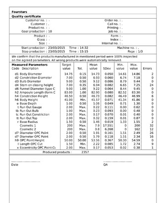 我們的安瓶機(jī)還備有在線攝像的尺寸和外觀檢測系統(tǒng),可同時(shí)檢測到安瓶的所有缺陷,對(duì)安瓶百分百檢測,通過檢測的安瓶保證百分之百是合格的,該生產(chǎn)線還裝有生產(chǎn)信息的記錄系統(tǒng),自動(dòng)生成產(chǎn)品的檢驗(yàn)報(bào)告