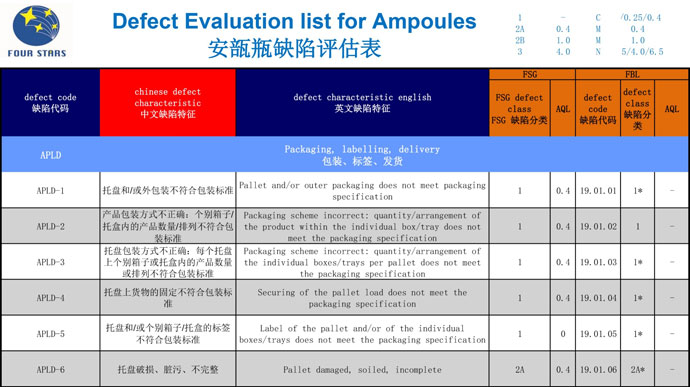 我們對(duì)安瓿的缺陷制定了缺陷評(píng)估表,對(duì)95項(xiàng)缺陷進(jìn)行質(zhì)量控制,涵蓋了全部的缺陷項(xiàng)目,能使您對(duì)我們的產(chǎn)品質(zhì)量完全放心。