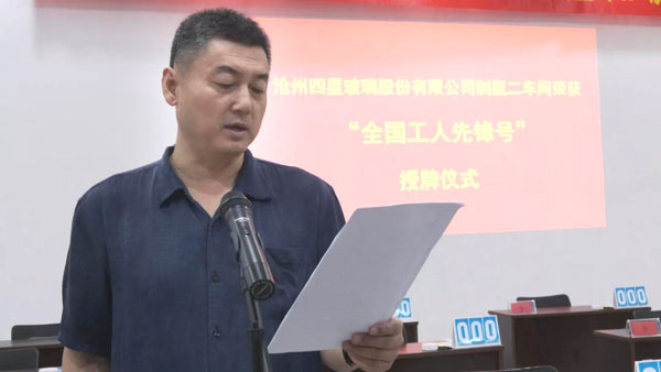 6月29日上午,滄縣總工會(huì)在滄州四星玻璃股份有限公司舉行“全國工人先鋒號(hào)”授牌儀式,為榮獲“全國工人先鋒號(hào)”的滄州四星玻璃股份有限公司制瓶二車間頒發(fā)表彰授牌,滄縣人大常委會(huì)副主任、總工會(huì)主席徐澤林,滄縣總工會(huì)黨組書記、常務(wù)副主席趙洪濤,中共滄縣縣委組織部副部長、兩新工委書記李金峰,滄州市總工會(huì)組織部副部長王超,紙房頭鎮(zhèn)黨委書記許勇,紙房頭鎮(zhèn)人大主席何玉利,紙房頭鎮(zhèn)人大副主席呂增煥,滄州四星玻璃股份有限公司董事長王煥一參加了授牌儀式。